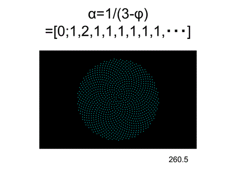 360×1/(3-φ)=260.5°=[0;1,2,1,1,1,1,1,1,1,・・・]