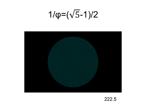 フェルマーらせん(r2=aθ)と黄金角が結びつくと、原点付近から無限遠まで一様な点分布が形成される.