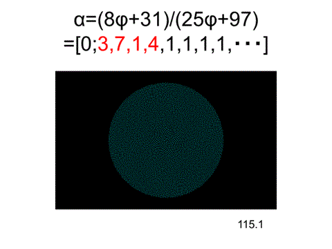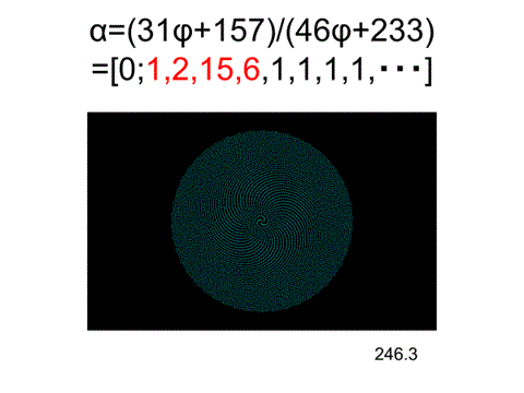 らせんの形状と開度αを変化させて無限遠での振る舞いを調べる。植物の話ではないのであるが、無限に大きいヒマワリを仮想する. それが無限遠で一様分布になるためにはフェルマーらせんで、αの連分数展開の部分商が有限に限ることが証明されている.