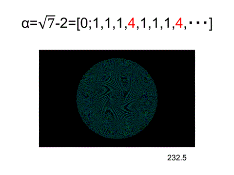 らせんの形状と開度αを変化させて無限遠での振る舞いを調べる。植物の話ではないのであるが、無限に大きいヒマワリを仮想する. それが無限遠で一様分布になるためにはフェルマーらせんで、αの連分数展開の部分商が有限に限ることが証明されている.