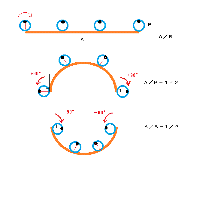 こんどは下の図のように、Aの両端を持って半円状になるまで上向きの力を加えてたわめてみる。するとAに接しているコインBの向きは変わって、左端で時計回りに90度、右端で反時計回りに90度回転する。この結果、Aの左端から右端まで転がる間にBは3回転から半回転減ることになる。この操作を、Aの両端が閉じるまで続けると、コインBはコインAを内回りすることになり、回転数は3回転−1回転となる。