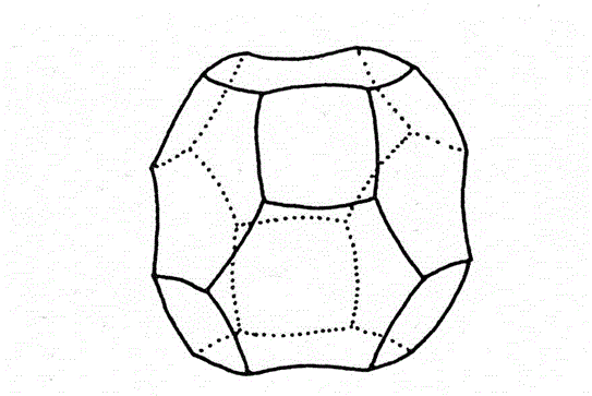 α-14面体に比較しても,辺が曲線になったり,面が曲面を含む点で幾何学的性質の単純さは劣りますが,五角形の面をもつという利点があります.すでに説明したように,分割多面体では5角形の面が最も多いのですが,α-14面体はまったく5角形の面をもちませんから,β-14面体のほうが空間分割のある側面をよく表していると考えることができます.