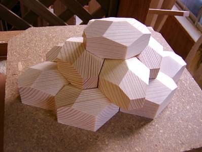 正12面体を周期的に配列させたときに現れる3個の菱形が直交したような形の隙間を12等分した三角錐で埋め尽くすこともできる.最後に,その平面表現も一緒に掲げる.