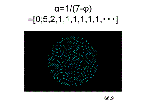 360×1/(7-φ)=66.9°=[0;5,2,1,1,1,1,1,1,・・・]