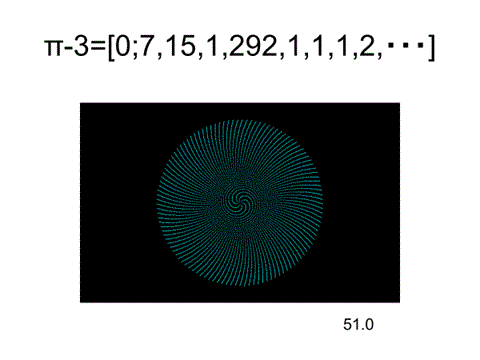 らせんの形状と開度αを変化させて無限遠での振る舞いを調べる。植物の話ではないのであるが、無限に大きいヒマワリを仮想する. それが無限遠で一様分布になるためにはフェルマーらせんで、αの連分数展開の部分商が有限に限ることが証明されている.