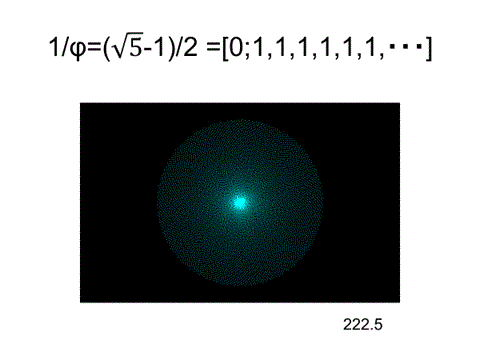 フェルマーらせん(r2=aθ)と黄金角が結びつくと、原点付近から無限遠まで一様な点分布が形成される.