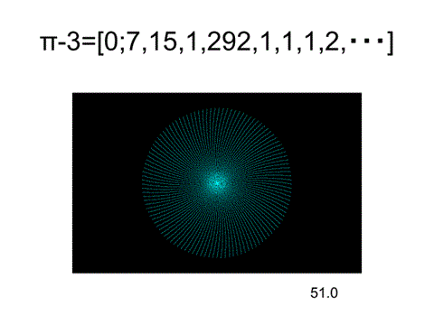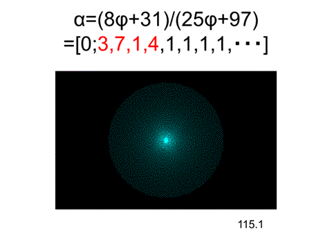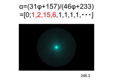 らせんの形状と開度αを変化させて無限遠での振る舞いを調べる。植物の話ではないのであるが、無限に大きいヒマワリを仮想する. それが無限遠で一様分布になるためにはフェルマーらせんで、αの連分数展開の部分商が有限に限ることが証明されている.