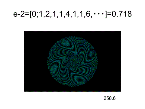 らせんの形状と開度αを変化させて無限遠での振る舞いを調べる。植物の話ではないのであるが、無限に大きいヒマワリを仮想する. それが無限遠で一様分布になるためにはフェルマーらせんで、αの連分数展開の部分商が有限に限ることが証明されている.