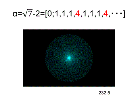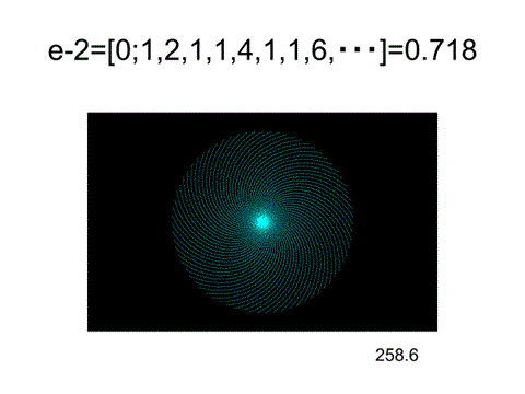 らせんの形状と開度αを変化させて無限遠での振る舞いを調べる。植物の話ではないのであるが、無限に大きいヒマワリを仮想する. それが無限遠で一様分布になるためにはフェルマーらせんで、αの連分数展開の部分商が有限に限ることが証明されている.
